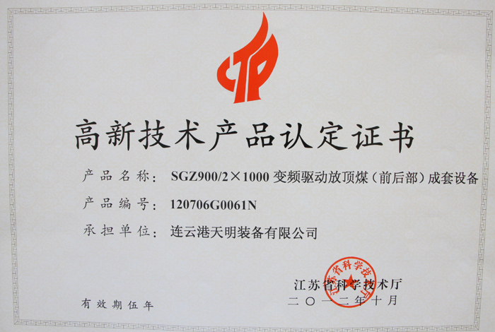 ● 2014年智能化大型变频刮板输送机成套装备承担江苏省重大科技成果产业化项目